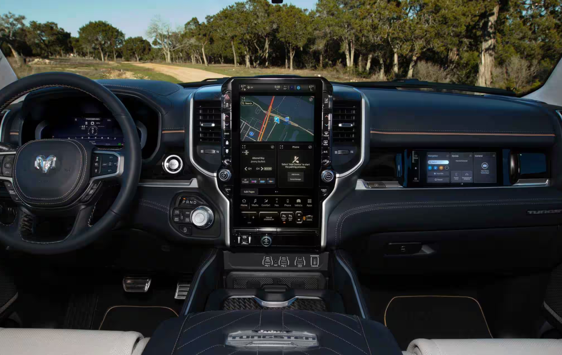 With engine options offering up to 420 horsepower and 469 lb-ft of torque, the 2025 RAM 1500 has no trouble pulling its weight. Towing capacity reaches 11,580 pounds when properly equipped, making it ideal for trailers, boats, or job site tools. The 8-speed automatic transmission shifts smoothly, whether driving across town or heading up the 403. For changing road conditions, drivers can choose from five drive modes—Auto, Tow, Snow, Sport, and Off-Road. These modes help you stay in control, from winter roads in Oakville to gravel trails near the countryside. Fuel efficiency begins at 9.4 L/100 km on the highway, giving you fewer stops even on longer drives.